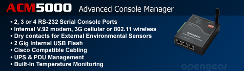 The Opengear ACM5000 delivers secure In-Band and Out-Of-Band access to remote sites from anywhere in the world. We give IT personnel remote hands to reach out to branch offices and wiring closets as if they were actually there on site. Simple and cost effective tools for managing the network, power and computer devices in small and large distributed networks. We help tame the complexities of remote administration.